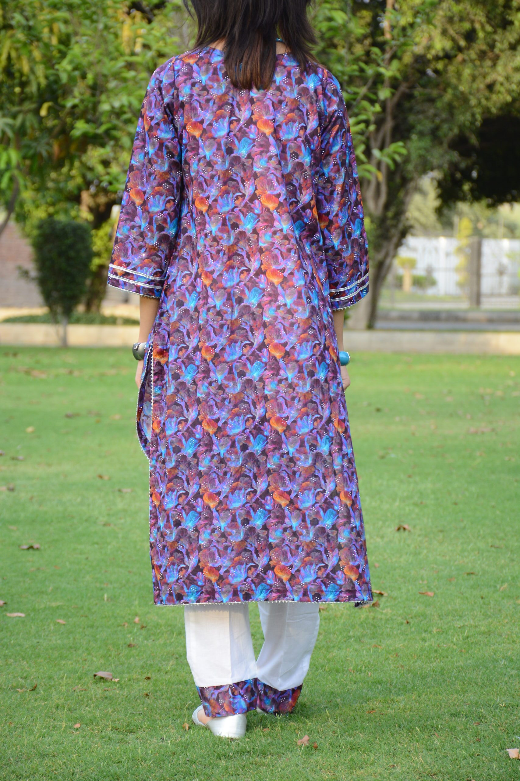 Elegant Angrakha-style shirt in Air Jet Mukesh cotton with a stylish slit, Chatta Patti detailing, and a traditional embroidered tassel. Paired with classic white Bareeze cotton pants—a timeless eastern look for girls.