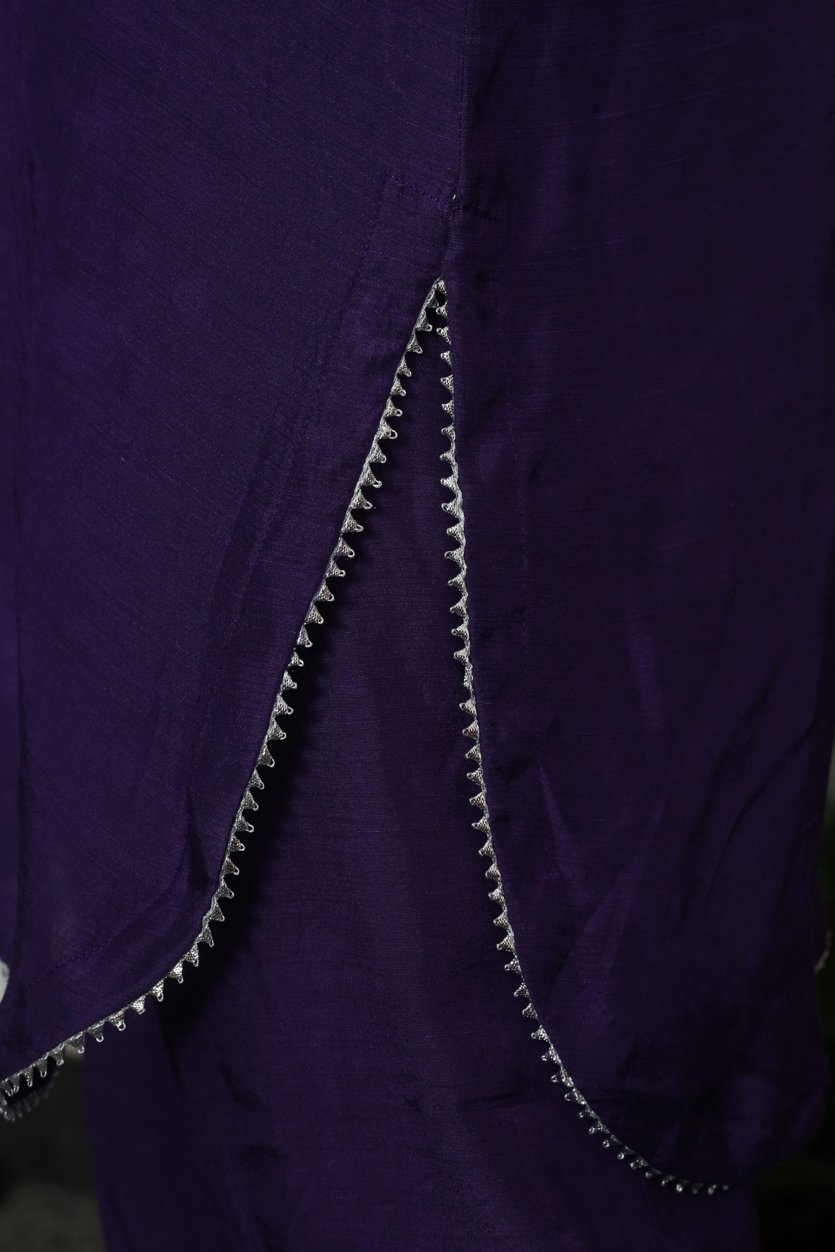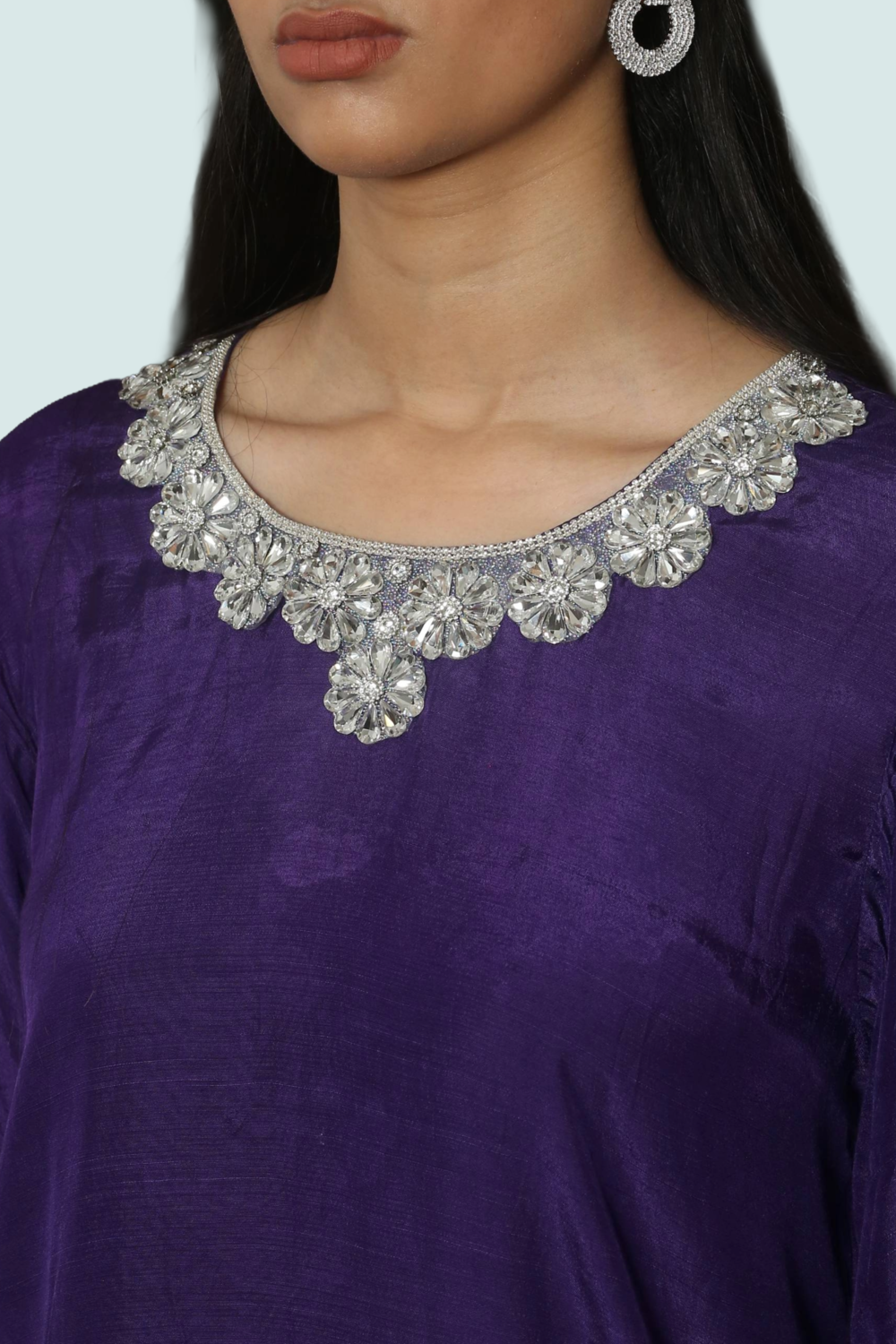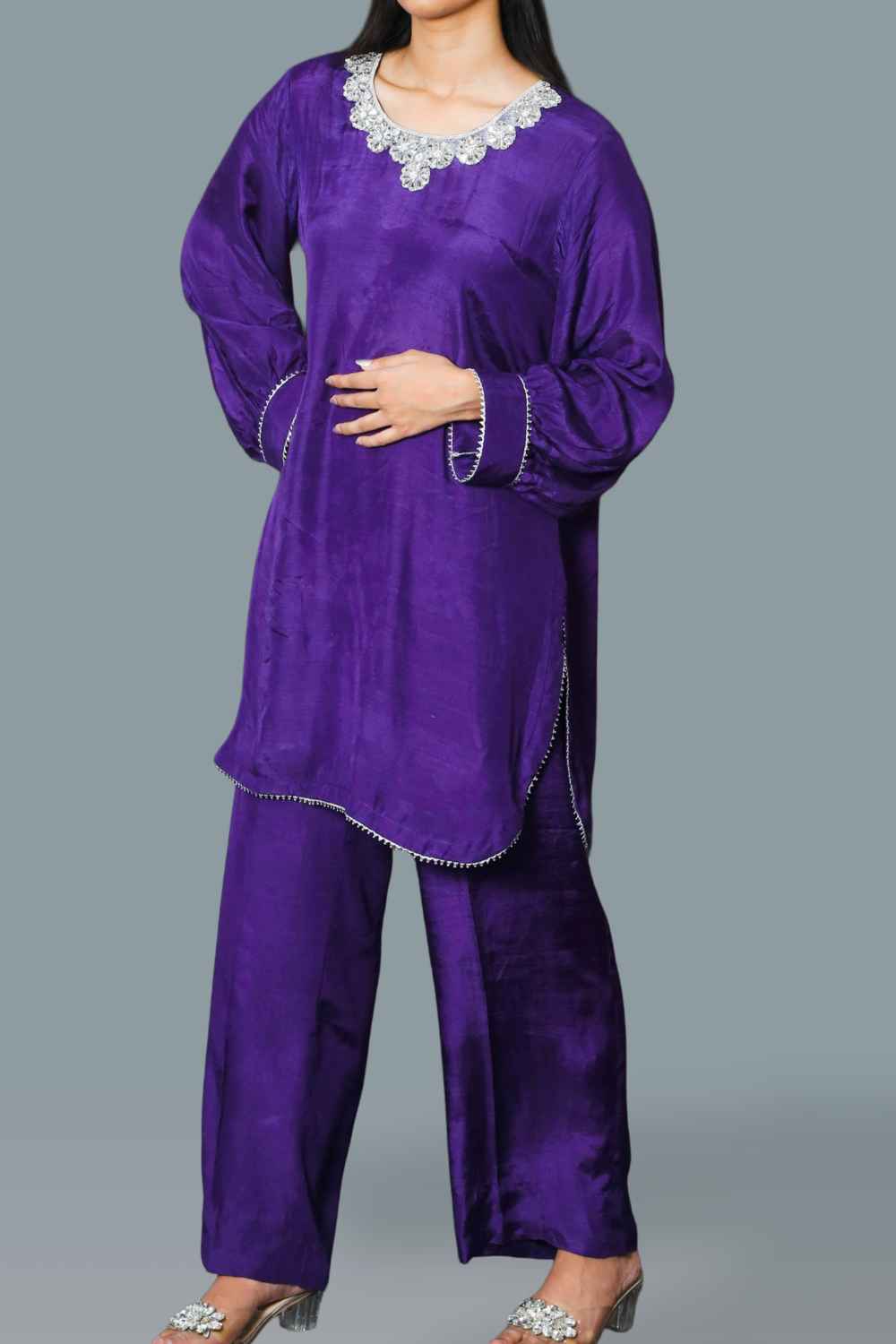 Turn heads in our Deep Purple Raw Silk Co-Ord Set, a statement ensemble designed for elegance and allure. Crafted from rich raw silk, this outfit is elevated with a sparkling rhinestone neckline that adds just the right touch of glam. The sophisticated French sleeves bring a graceful silhouette, making it a perfect pick for formal evenings and special occasions.