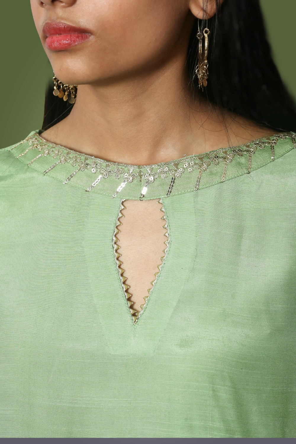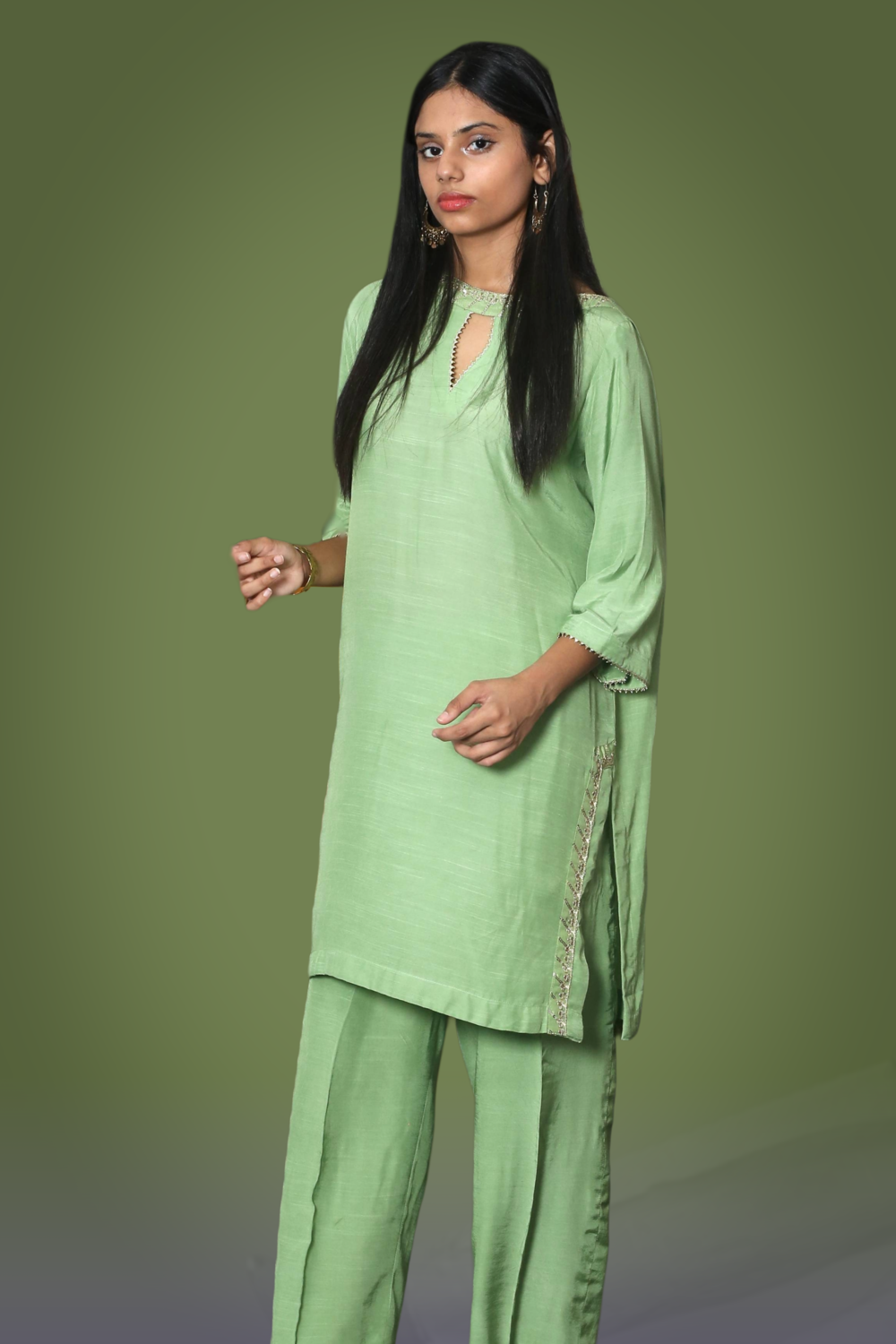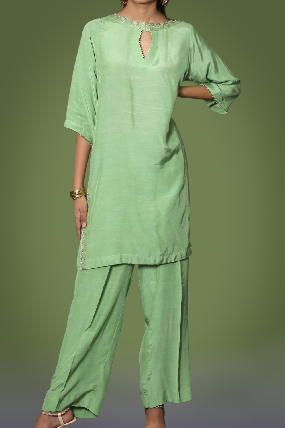Elevate your party look with our Pistachio Green Co-Ord Set, crafted from premium raw silk. This stunning ensemble blends modern charm with timeless elegance, featuring exquisite details that add a luxurious finish to the outfit. Designed as the perfect party wear, it offers both sophistication and comfort—making it an effortless choice for festive gatherings and special occasions.