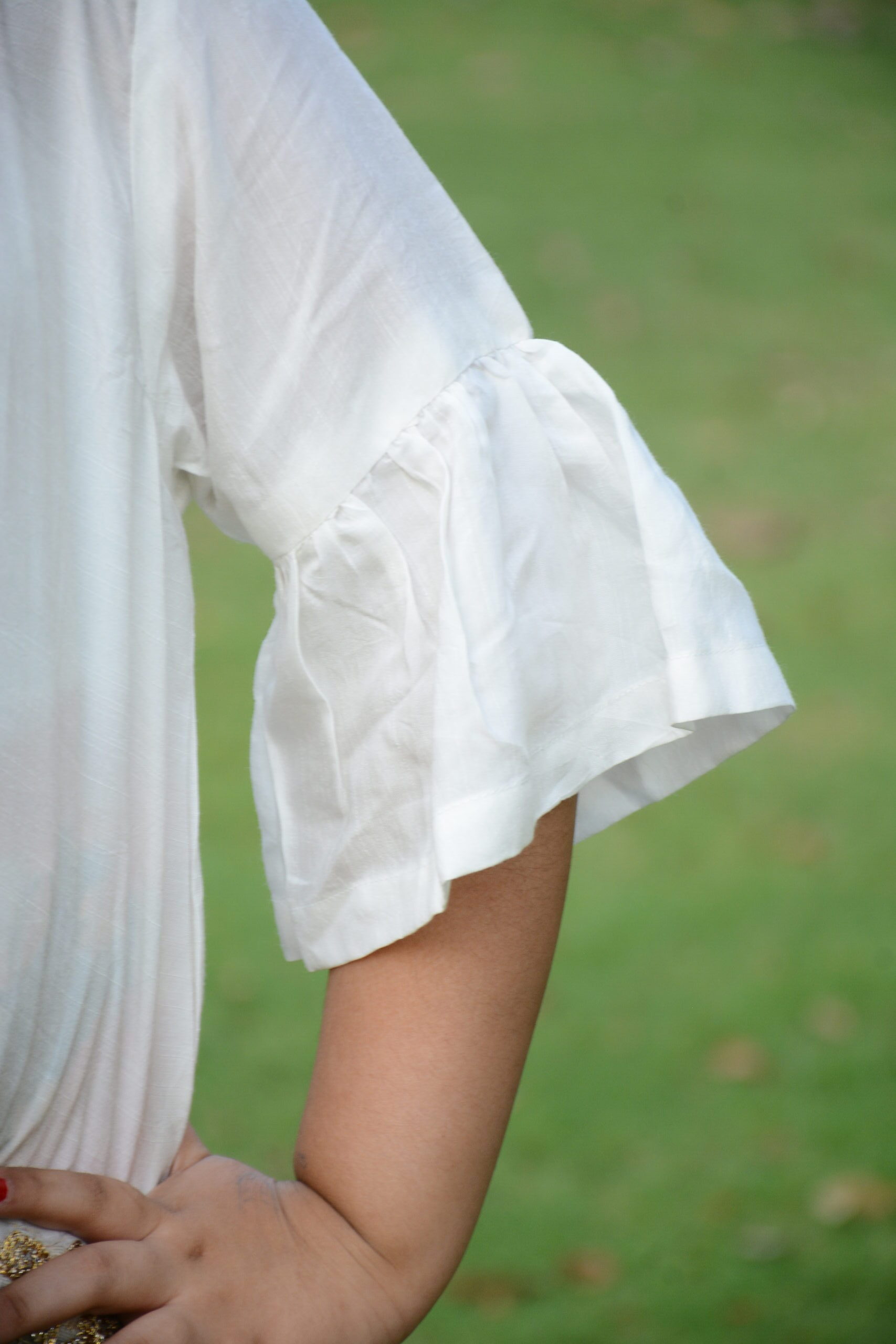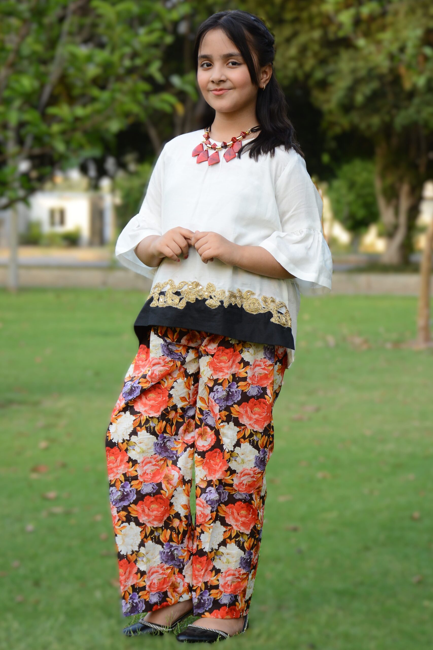 This elegant Eastern outfit features a white baggy short shirt with stylish sleeves, paired with airjet mukesh cotton wide-legged culottes in a chic black floral print. The culottes are finished with a black border and golden zari lace, blending tradition with modern style. Perfect for festive occasions or casual elegance.